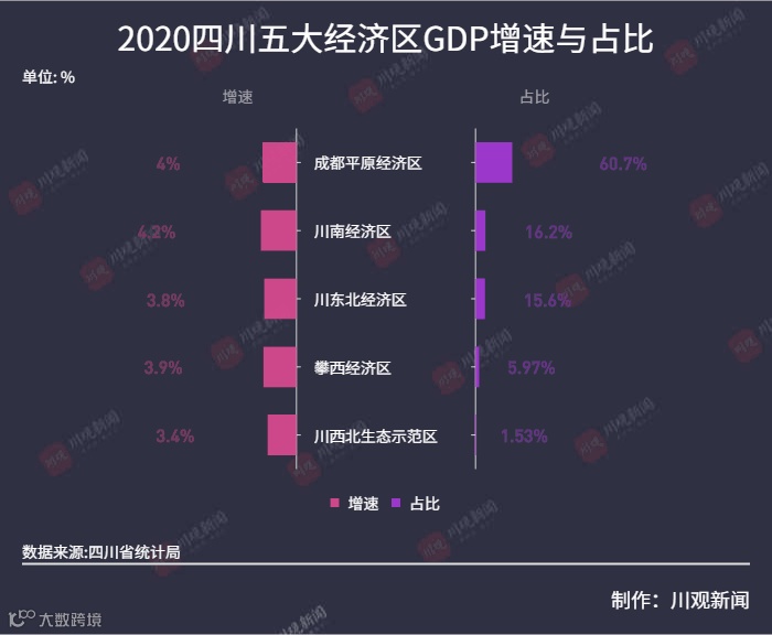 成效用数据说话。拉动全省经济增长的三大主力舰队——成都平原、川南、川东北经济区,2020年分别增长4%、4.2%、3.8%,增速高出全省平均水平或与之持平,形象诠释了“压舱石”作用。省统计局还公布了2020年各经济区占全省经济的比重,由此可以计算出,上述三大经济区2020年的GDP总量分别是2017年的1.26倍、1.29倍、1.28倍,增长势头强劲。