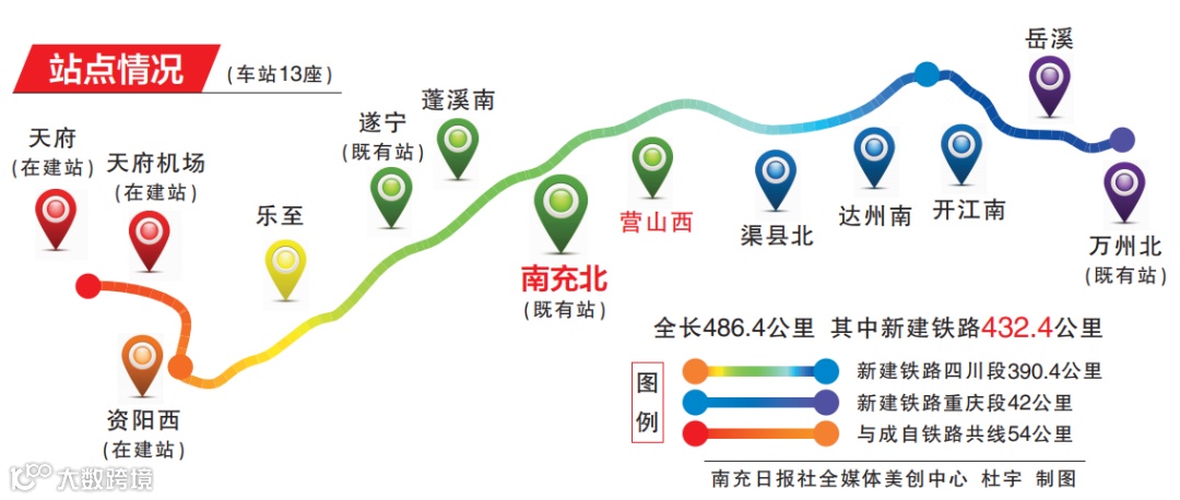 按照规划,成达万高铁全线设13座车站,新建乐至、蓬溪南、营山西、渠县北、达州南、开江南、岳溪7座车站,引入遂宁、南充北、万州北3座既有车站,利用成自高铁天府、天府机场、资阳西3座在建车站。