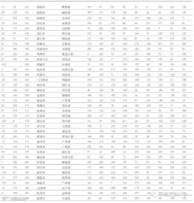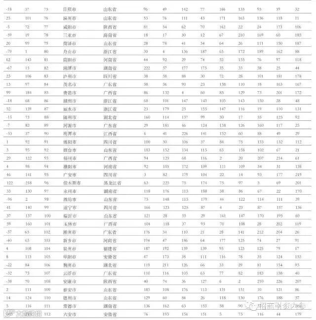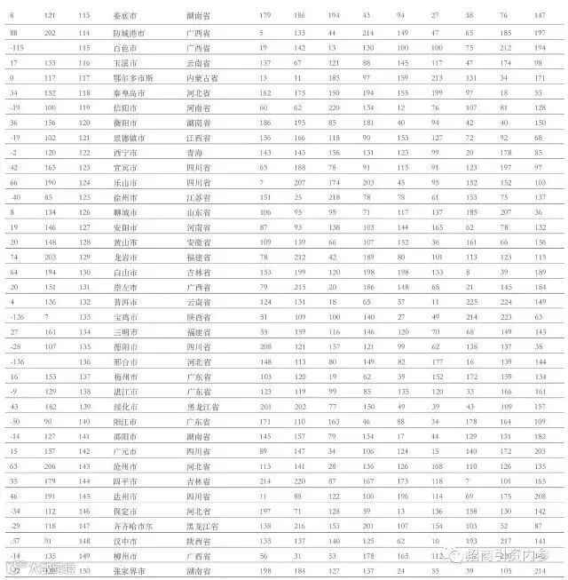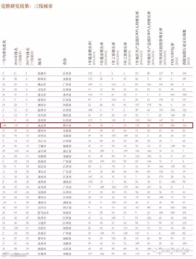 在三线城市中,前十五名依次为:南通、蚌埠、佛山、吉安、遵义、泰州、漯河、扬州、宜昌、苏州、南充、滁州、宿州、九江、宁德。