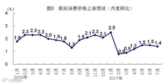 7月份,全国居民消费价格同比上涨1.4%,涨幅比上月回落0.1个百分点。分类别看,食品烟酒价格同比下降0.1%,衣着上涨1.4%,居住上涨2.5%,生活用品及服务上涨1.1%,交通和通信下降0.2%,教育文化和娱乐上涨2.5%,医疗保健上涨5.5%,其他用品和服务上涨1.3%。在食品烟酒价格中,粮食价格上涨1.6%,猪肉价格下降15.5%,鲜菜价格上涨9.1%。7月份,全国居民消费价格环比上涨0.1%。1-7月份,全国居民消费价格同比上涨1.4%。