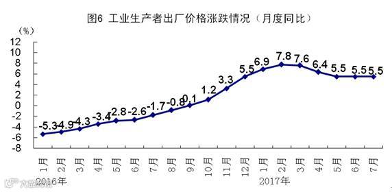 7月份,全国工业生产者出厂价格同比上涨5.5%,涨幅与上月持平,环比上涨0.2%。1-7月份,全国工业生产者出厂价格同比上涨6.4%。7月份,全国工业生产者购进价格同比上涨7.0%,环比持平。1-7月份,全国工业生产者购进价格同比上涨8.5%。