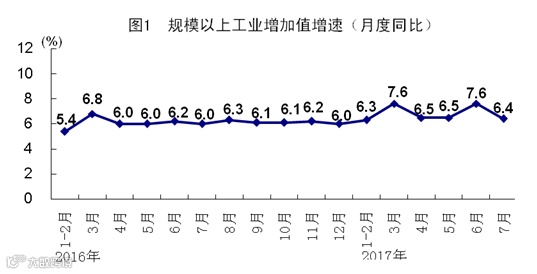 7月份,全国规模以上工业增加值同比实际增长6.4%,增速比上月回落1.2个百分点,比上年同月加快0.4个百分点。分经济类型看,国有控股企业增加值同比增长6.7%,集体企业下降3.6%,股份制企业增长6.7%,外商及港澳台商投资企业增长6.7%。分三大门类看,采矿业增加值同比下降1.3%,制造业增长6.7%,电力、热力、燃气及水生产和供应业增长9.8%。高技术产业和装备制造业增加值同比分别增长12.1%和10.7%,增速分别比规模以上工业快5.7和4.3个百分点。规模以上工业企业产销率达到97.9%。从环比看,7月份全国规模以上工业增加值比上月增长0.41%。1-7月份,全国规模以上工业增加值同比增长6.8%。7月份,制造业采购经理指数为51.4%,连续12个月处于扩张区间。