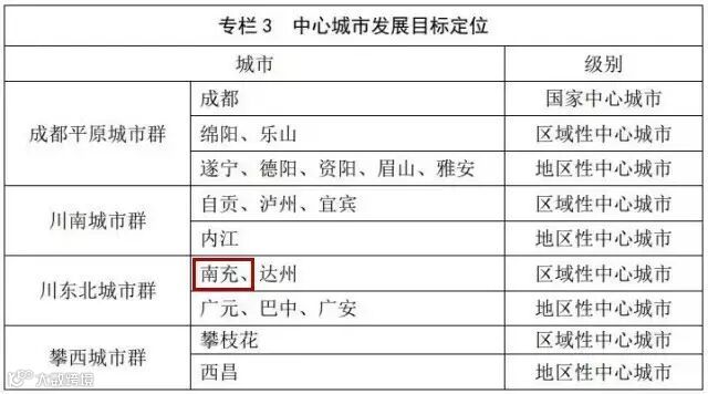 2016年4月底,国家发改委、住建部印发《成渝城市群发展规划》,明确成都建设国家中心城市的定位。此外,南充也成功进入国家区域中心城市的大盘子里。