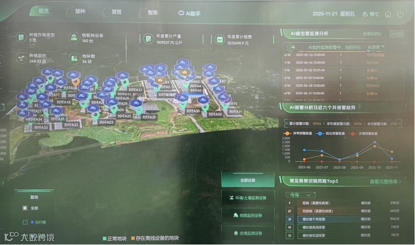 据介绍,“慧种植”平台将现实农场进行数字化重建,通过可视化驾驶舱、农场管理、慧种、慧管、AI助手、智库六大功能模块,实现对农场的全方位智能化管理。