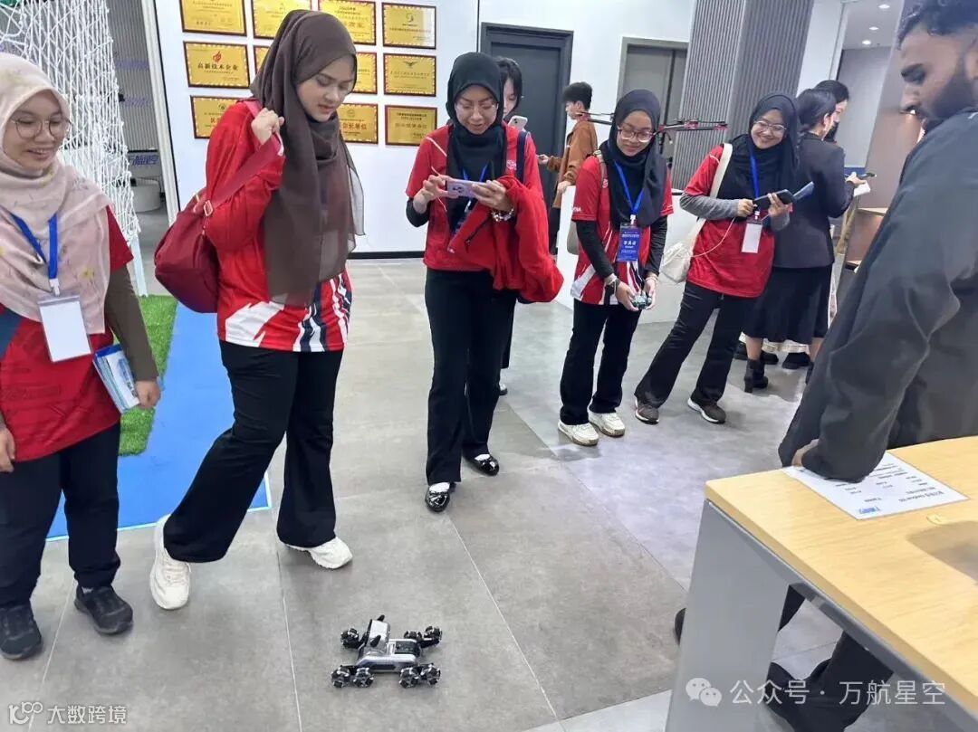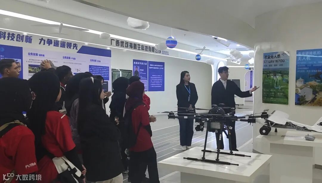 马来西亚博特拉大学的师生们踏入低空未来科技馆,从无人机的研发设计,到生产制造,再到广泛的应用服务领域,每一个展示板块都吸引着师生们的目光,激发着他们浓厚的兴趣。在工作人员深入浅出的讲解下,师生们详细了解了无人机在农业植保、地理测绘、应急救援、低空物流等多元化场景中的应用。