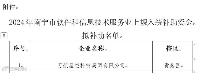 近日,南宁市工业和信息化局网站公示了关于2024年南宁市软件和信息技术服务业上规入统企业补助资金拟补助名单,拟认定园区企业万航星空科技集团有限公司符合2024年南宁市软件和信息技术服务业上规入统企业补助条件。