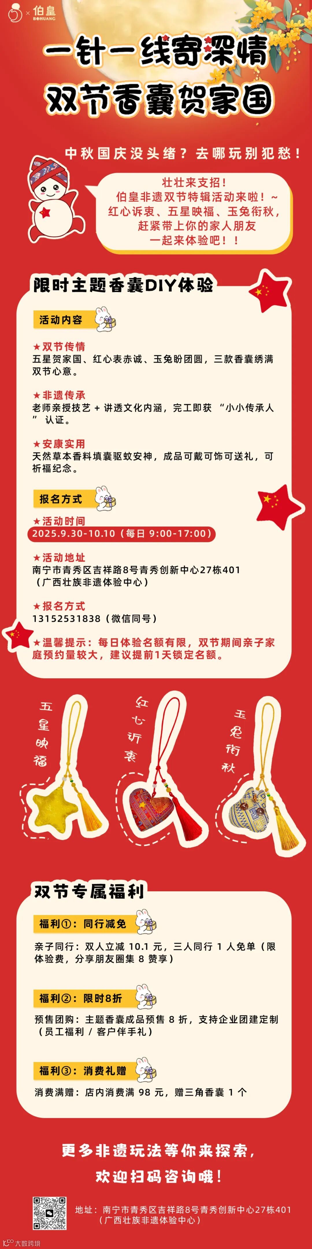 中秋与国庆撞个满怀,家国同庆的美好时刻,总想做点什么来纪念。别发愁啦,伯皇非遗双节特辑活动暖心上线,“红心诉衷”“五星映福”“玉兔衔秋” 三款主题香囊,邀你一针一线,绣出双节的浓情蜜意,感受非遗文化的独特魅力~