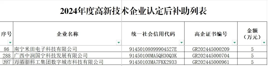 4月,南宁市科技局官网发布2024年度高新技术企业认定后补助名单。拟对青秀创新中心园区企业南宁米田电子科技有限公司、广西中润国宁科技发展有限公司、万基泰科工集团数字城市科技有限公司,3家已通过国家高企认定的企业给予经费补助。