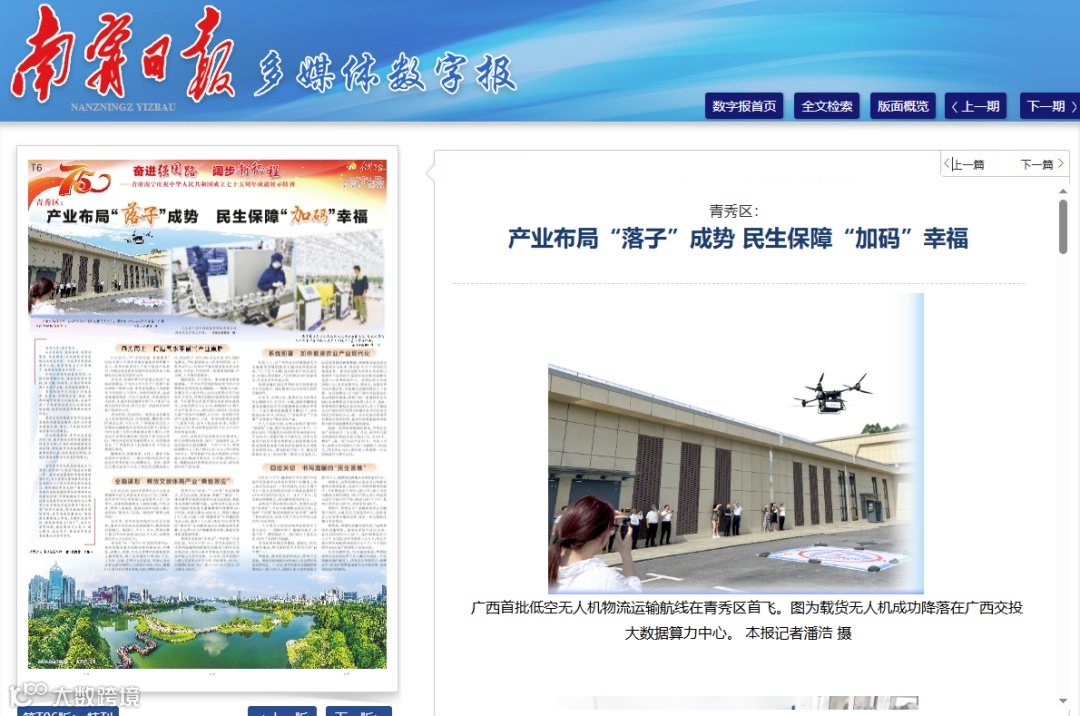 乘风而起,向光而行。青秀区率先推动无人机在物流配送、应急救援、测绘等方面的试点应用:今年6月,广西首批低空无人机物流运输航线在青秀区成功首飞;在郁江2024年第1号洪水洪峰通过南宁期间,6家企业在青秀区相关部门组织下参与防汛巡航。“能为应急防汛贡献绵薄之力,我们颇感自豪。”广西景航无人机有限公司飞行部主管刘庆泽说。
