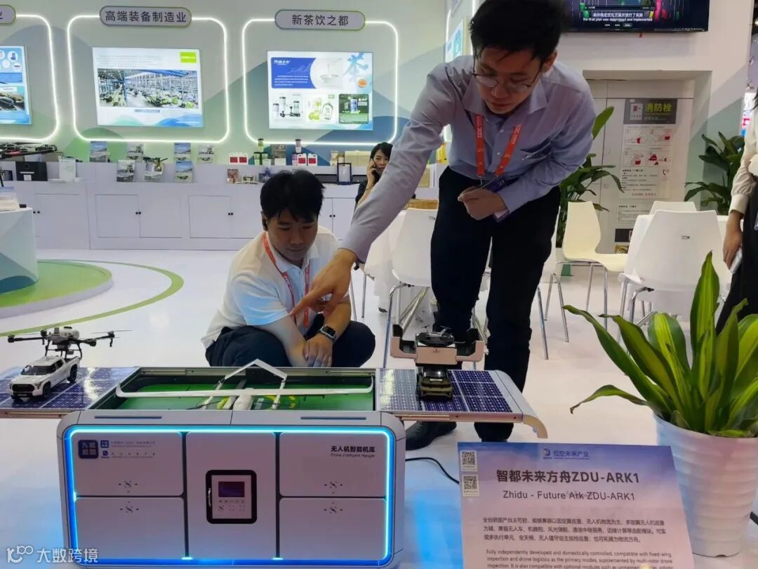 广西智都信息科技有限公司展出在地理测绘、应急救援、货物运输等应用领域的无人机产品,智都研发的“未来方舟2.0”可以满足以固定翼巡查、无人机物流为主,多旋翼无人机巡查为辅等应用场景,且能兼容无人车、机器狗,并有风光储能、通信中继服务、边缘计算等选配模块,具有多执行单元、全天候、无人值守、自主巡检巡查等优势,也可拓展为物流方舟。