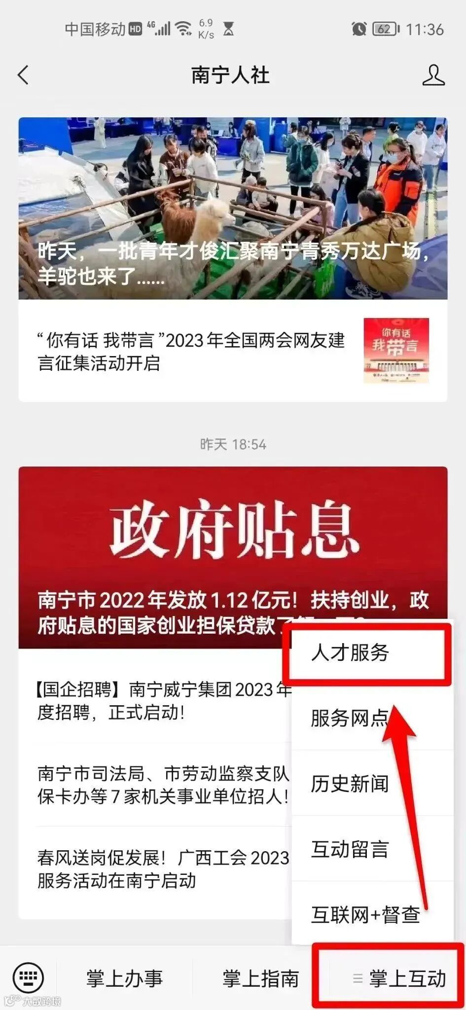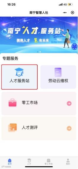第一步:进入南宁人社微信公众号首页,点击掌上互动>>>人才服务>>>人才服务站>>>人才服务