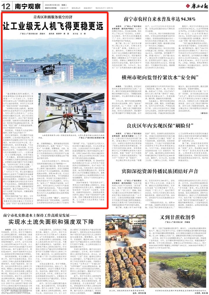 近日,《广西日报》报道青秀创新中心园区低空经济企业不断拓宽低空应用场景,特别是在工业级无人机应用场景的拓展上,已取得显著成效。报道指出,2024年被誉为“低空经济元年”,青秀区已在新的赛道上持续发力。