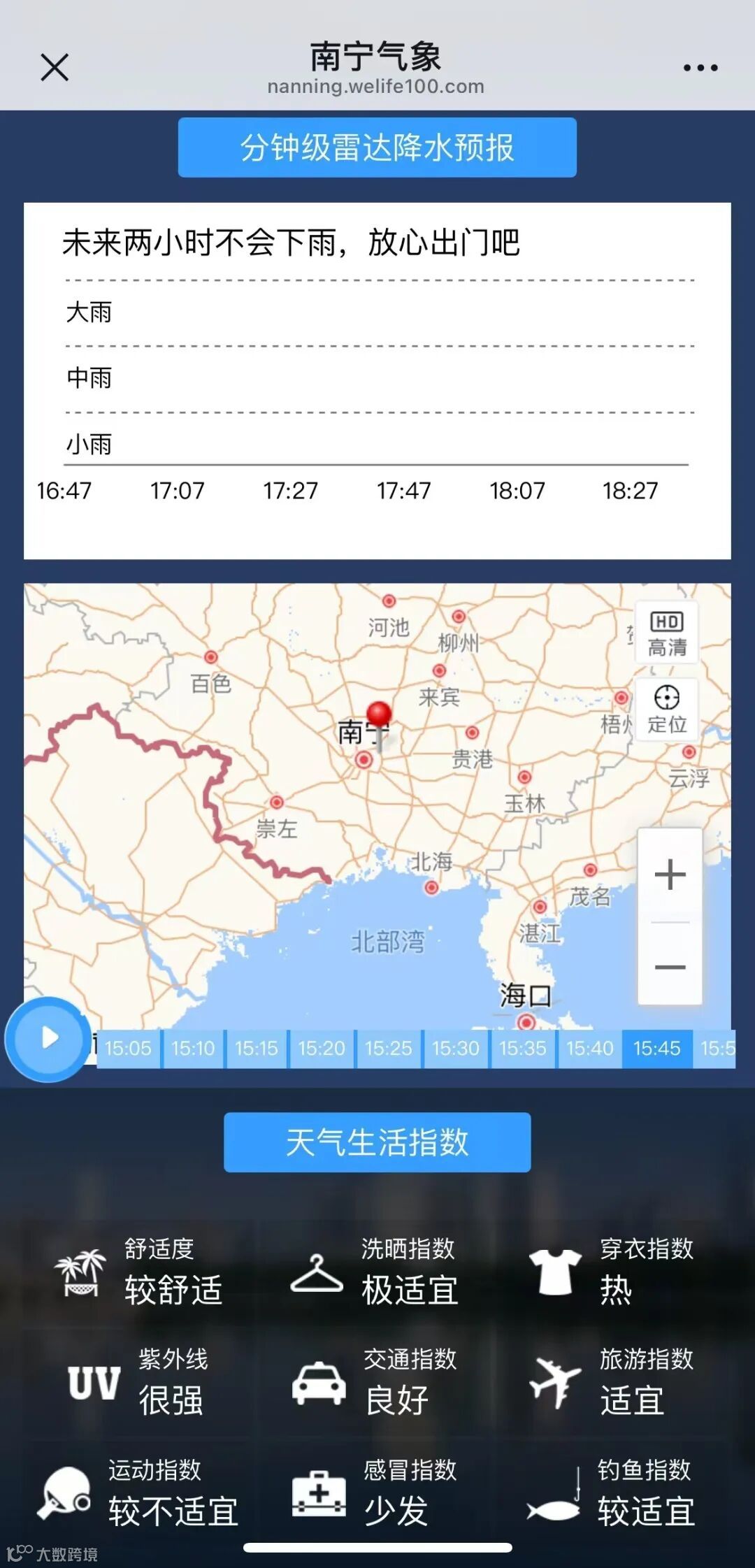 为更好地应对极端天气气候带来的挑战,助力低空经济发展,青秀创新中心联合南宁市气象局,开设【低空气象服务】栏目。园区低空经济相关企业可随时随地查看实时天气情况,进一步强化了气象预报预警,降水预报精准到分钟级,为无人机起降提供及时精准的决策依据。