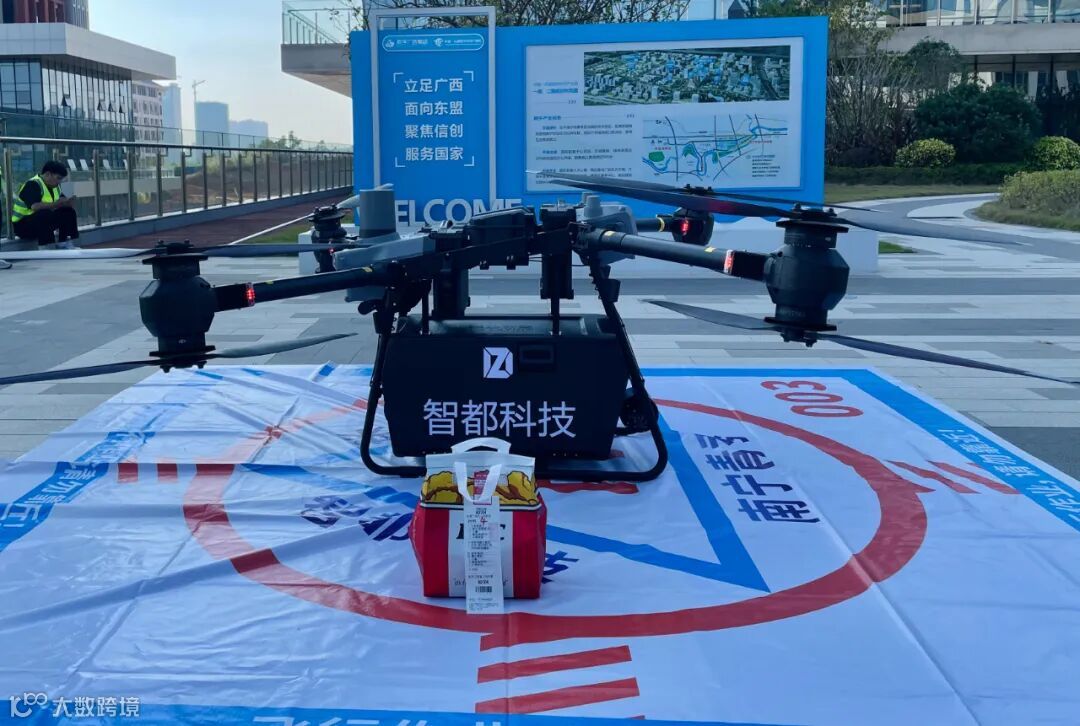 在南宁-东盟低空智联网运营服务中心,智都低空未来产业运营团队通过远程调控,一架携带外卖保温箱的运载无人机缓缓平稳降落,准确停放在仙葫广场低空物流起降点。工作人员仔细检查外卖打包情况后整齐放入箱内,随后,智都运载003号无人机平稳升空,按照既定低空物流配送航线飞向11公里外的中国-东盟数字经济产业园。