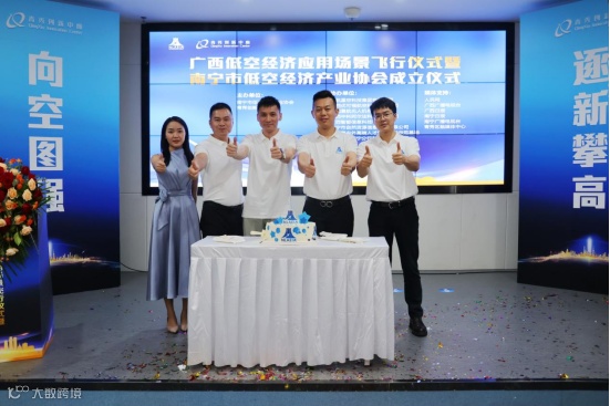 活动现场,南宁市低空经济产业协会会长王伟任、副会长谢冠鸿、副会长廖旭华、副会长李自练、秘书长李振兴等共同切蛋糕庆祝南宁市低空经济产业协会正式成立!