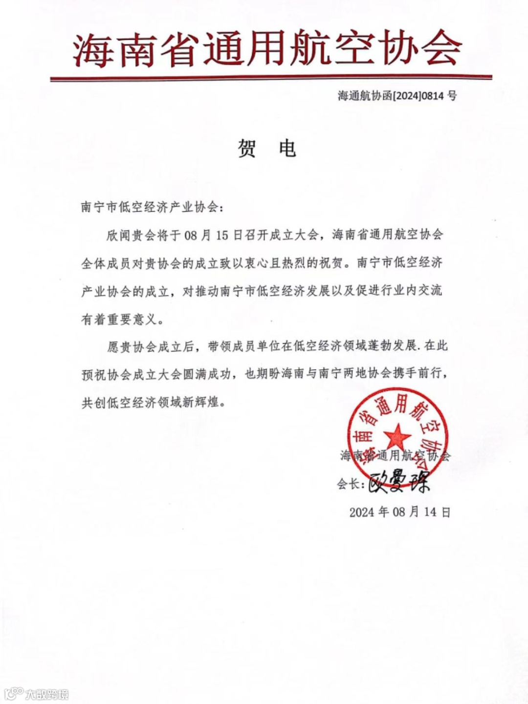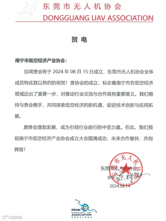 在协会成立之际,东莞市无人机协会、海南省通用航空协会等区内外行业协会也发来贺信。东莞市无人机协会会长蔡辉敏表示,南宁市低空经济产业协会的成立是南宁市低空经济发展的重要举措,期待与南宁市低空经济产业协会加强沟通与协作,共同探索低空经济领域的新机遇、新模式,携手推动低空经济产业的繁荣发展。