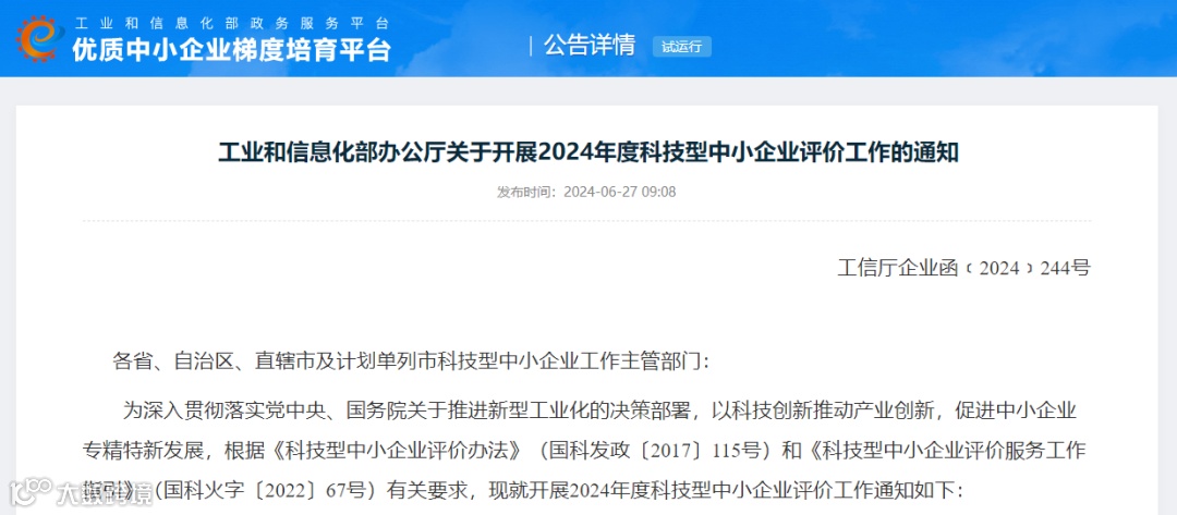 工业和信息化部办公厅关于开展2024年度科技型中小企业评价工作的通知,2024年度科技型中小企业评价工作于6月27日启动并开放平台,9月30日停止企业信息填报,10月31日前完成所有批次拟入库企业公示,12月15日前完成入库企业集中随机抽查和相关处理工作,12月31日前完成并提交年度评价工作总结。