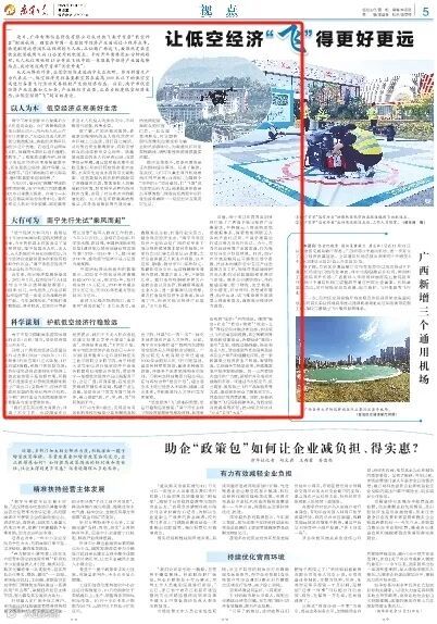 11月22日,《南宁日报》头版以《让低空经济“飞”得更好更远》为题,聚焦报道青秀创新中心园区企业、南宁市低空经济产业协会目前在“低空经济”产业取得的显著成效。
