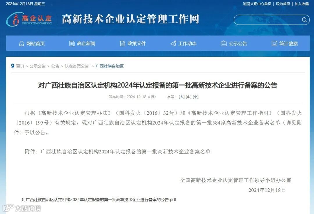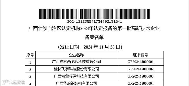 12月18日,高新技术企业认定管理工作网发布《对广西壮族自治区认定机构2024年认定报备的第一批高新技术企业进行备案的公告》,青秀创新中心园区企业南宁米田电子科技有限公司上榜!截至目前,园区累计引进及培育高企12家。。