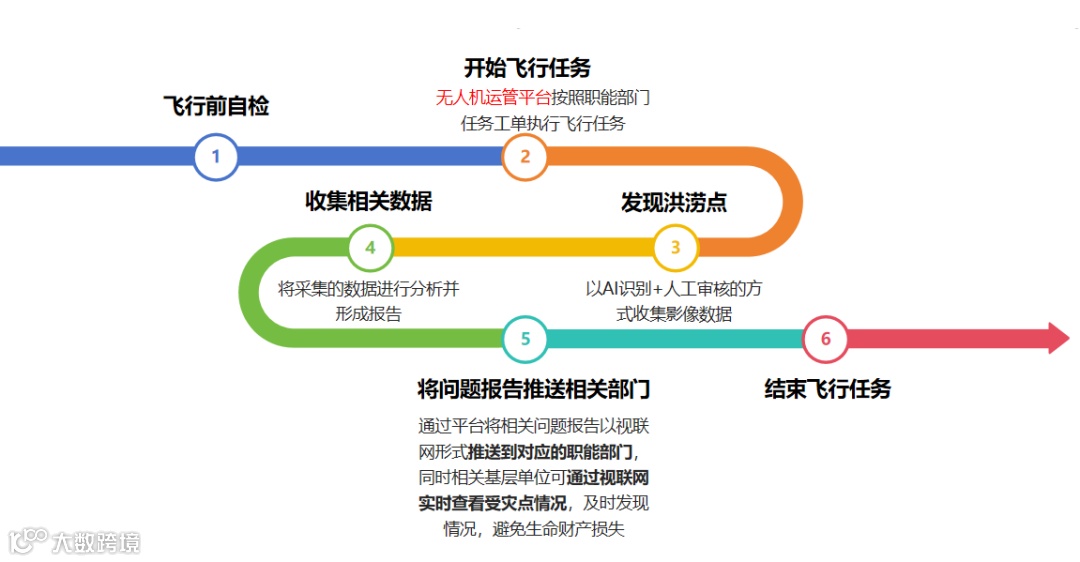 一旦发现险情,监控人员应立即向地面指挥员及防汛部门报告,并提供详细的位置信息与现场画面;地面指挥员根据险情严重程度,协调救援力量前往处置;通过综治中心综治视联网设备将飞行巡检实时画面回传至受灾点基层单位综治中心,协助基层人员发现灾情,解决灾情;当退洪后亦可通过此类方法对灾情点进行二次复查,避免灾后二次伤害发生。
