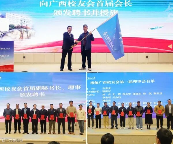 崔海涛为新任会长颁发聘书并授予会旗,航天学院广西招生组组长、党校副校长、组织部副部长庞小燕为新任副会长、秘书长颁发聘书,航天学院副院长朱旭东为新任副秘书长、理事颁发聘书。
