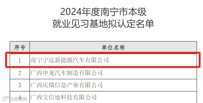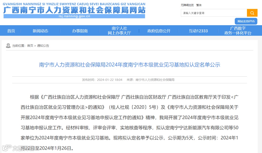 1月22日,在南宁市人社局公示的《南宁市人力资源和社会保障局2024年度南宁市本级就业见习基地拟认定名单公示》中,青秀创新中心入驻企业南宁宁达新能源汽车有限公司拟认定为南宁市就业见习基地。获得认定的企业招聘见习人员,可获得人力资源社会保障部门给予的就业见习补贴。