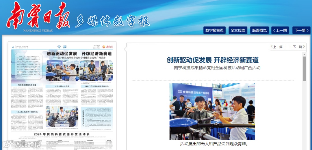 在本次主场展示活动中,南宁围绕活动主题积极组织科技企业参加线下展出,参展项目涵盖工程机械、高端铝合金新材料、绿色化工新材料、现代特色农业、低空经济等领域。值得一提的是,在科技创新成果展区,南宁带去了低空经济领域的7项科技成果,全面展现了近年来南宁实施创新驱动发展战略、积极发展低空经济所取得的科技创新成就,获得了与会人员及专业观众的广泛好评。