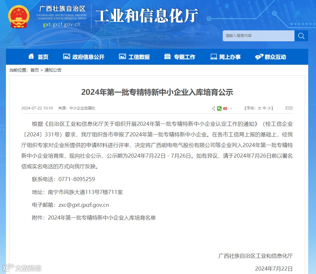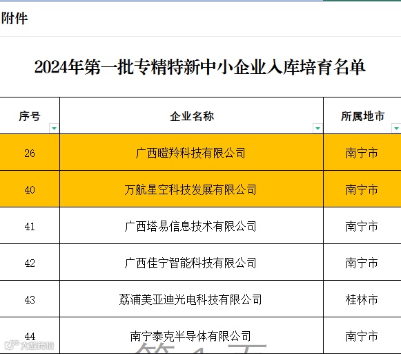 喜报!7月22日,广西壮族自治区工业和信息化厅公布了2024年第一批专精特新中小企业入库培育名单,青秀创新中心园区企业广西瞪羚科技有限公司、万航星空科技集团有限公司(曾用名:万航星空科技发展有限公司)成功入选!