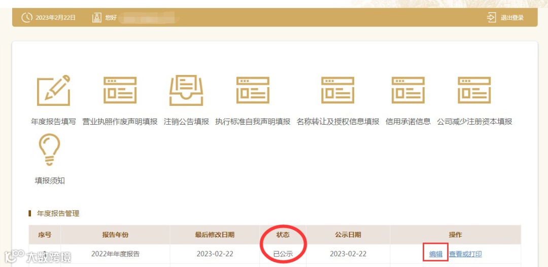 报送成功后页面自动显示记录;企业发现其年度报告内容不准确的,可以于报告当年6月30日前进入“编辑”页面进行更正。