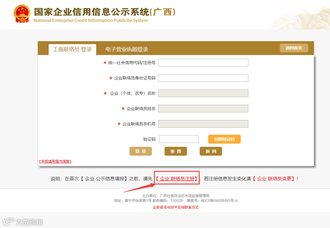 用联络员手机短信验证登录。首次报送企业信息时,需由企业确定一名企业联络员,并通过公示系统中“企业联络员注册”后方可登录。