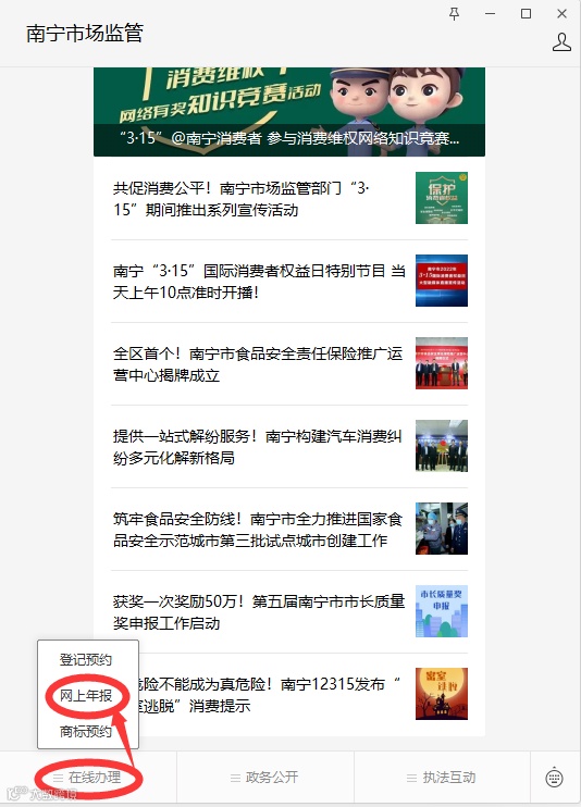 或者关注“南宁市场监管”微信公众号登录网上年报界面报送并公示2023年度年报信息。