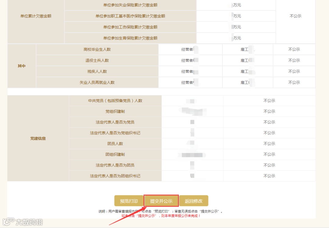 确认无误后点击“提交并公示”“确认”,完成年报公示;如未点击“提交并公示”,则所写信息仅保存成功,未进行公示,年报未完成。
