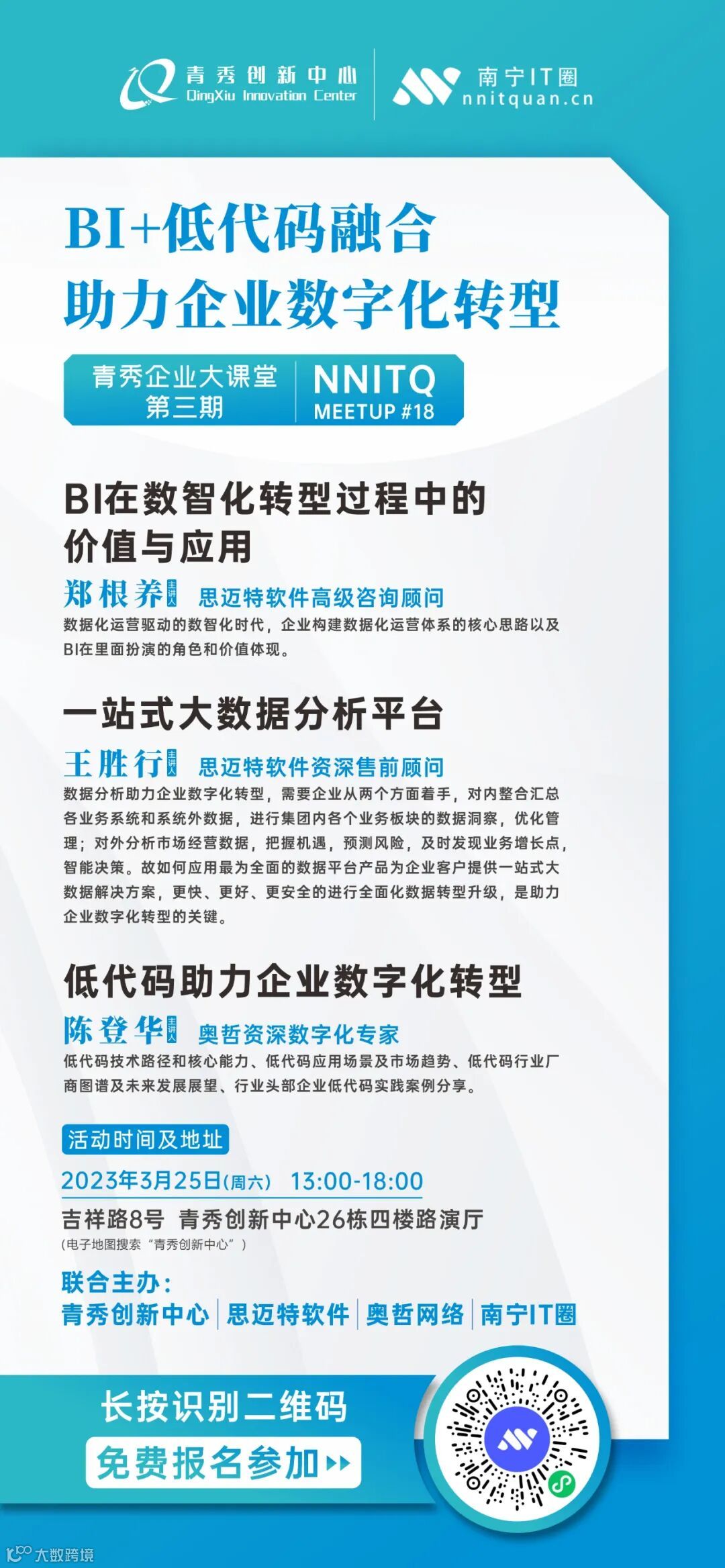 为扩大影响力、服务城区企业、增加招商渠道,青秀创新中心与财务、税务、法律、项目申报等第三方机构合作,开展“青秀企业大课堂”这一品牌活动。经与南宁IT圈联系,“青秀企业大课堂”第三期的内容为知识讲座——《BI+低代码融合助力企业数字化转型》,将于3月25日(本周六)下午举办。本次讲座由思迈特软件联合奥哲低代码,与企业代表一起探讨数字化时代下,BI技术与低代码如何更好地融合为企业带来1+1大于2的帮助。