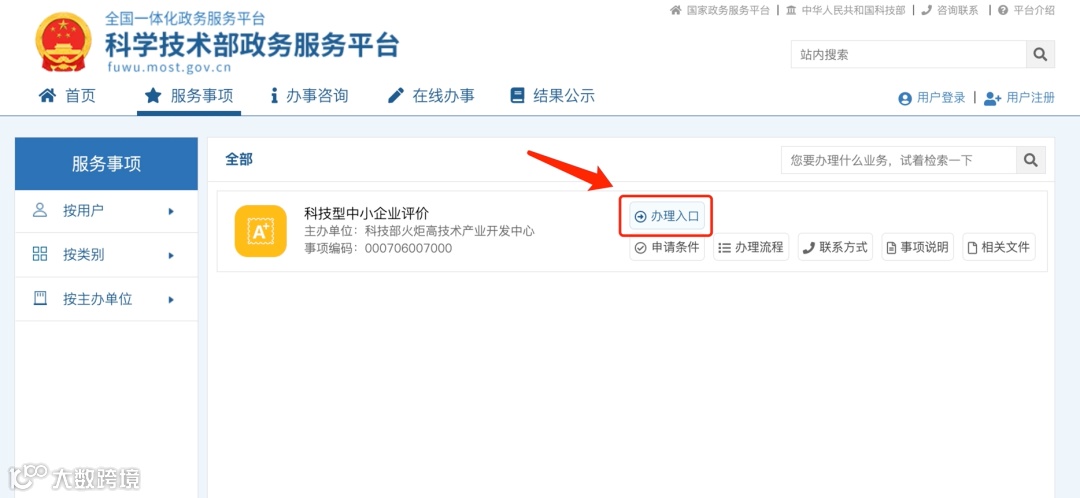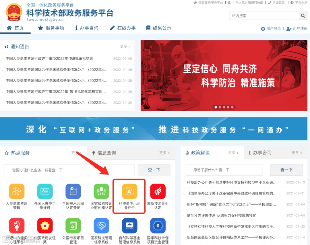 1.打开浏览器,搜索“科学技术部政务服务平台”(网址:fuwu.most.gov.cn),点击“热点服务”中的【科技型中小企业评价】。