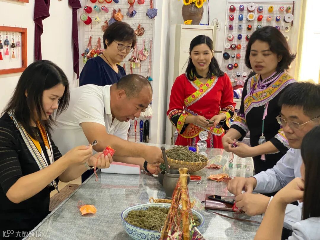 考察团实地走访了园区企业广西东方道迩科技有限公司、广西伯皇文化传播有限公司,了解企业发展历程、产业布局、产品类型、技术研发等情况。在广西东方道迩科技有限公司,考察组集中观看了该公司根据实景三维重建应用的不同需求生产的专用处理产品展示;在广西伯皇文化传播有限公司,考察组参观了自治区级非物质文化遗产“麽乜”文创产品,并亲自体验了三角香囊制作技艺。考察组对企业的经营发展及创新成效表示肯定。