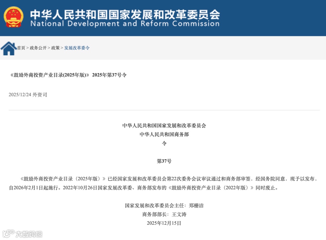 近日,经国务院同意,国家发展改革委、商务部全文发布《鼓励外商投资产业目录(2025年版)》(以下简称《鼓励目录》),自2026年2月1日起施行。