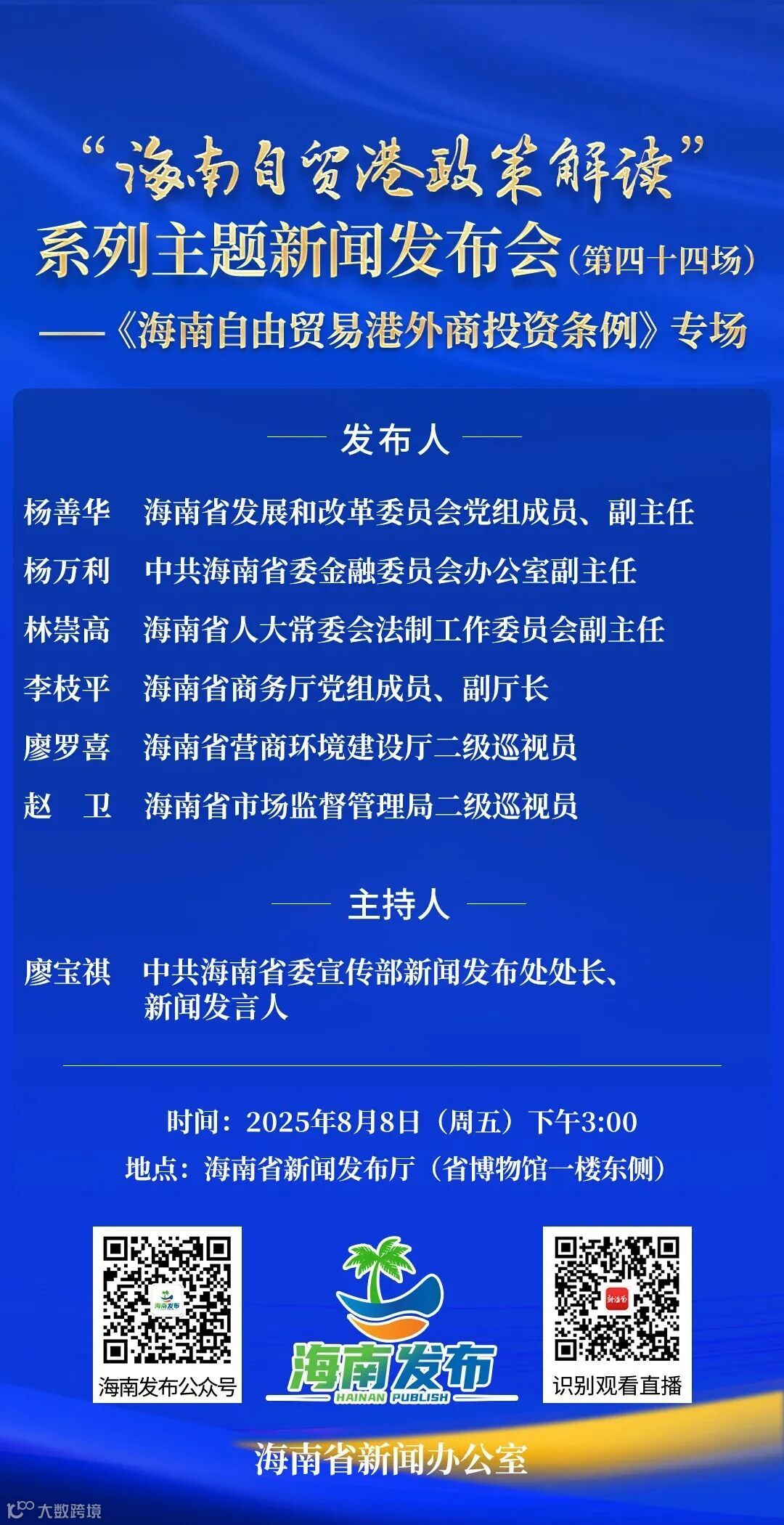 海南省新闻办公室将于2025年8月8日(星期五)下午3:00在海南省新闻发布厅(省博物馆一楼东侧)举行“海南自贸港政策解读”系列主题新闻发布会(第四十四场)——《海南自由贸易港外商投资条例》专场,邀请海南省发展和改革委员会党组成员、副主任杨善华,中共海南省委金融委员会办公室副主任杨万利,海南省人大常委会法制工作委员会副主任林崇高,海南省商务厅党组成员、副厅长李枝平,海南省营商环境建设厅二级巡视员廖罗喜,海南省市场监督管理局二级巡视员赵卫介绍相关情况,并答记者问。