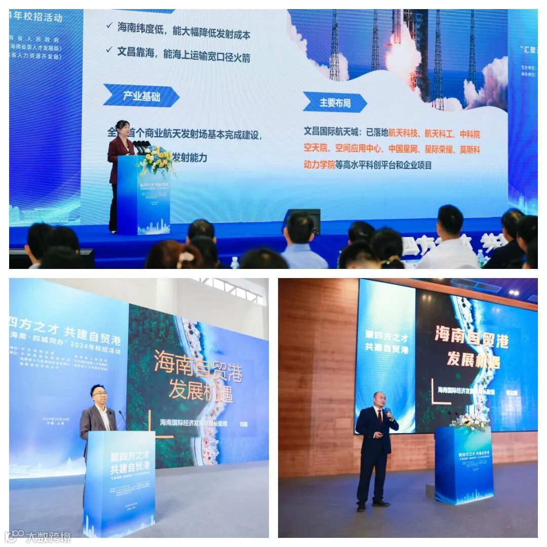 从上到下逆时针方向:海南国际经发局总经济师曾蓉在武汉大学,局长助理刘建在上海交通大学,局长助理蒋志敏在华南理工大学推介海南发展机遇