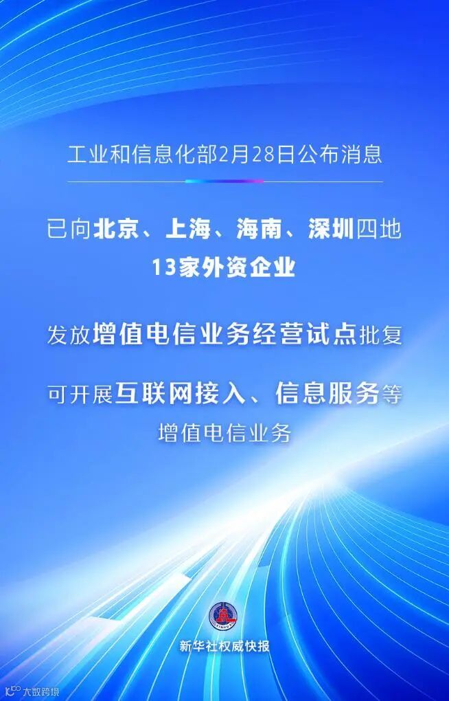 工业和信息化部近日向北京、上海、海南、深圳四地13家外资企业发放增值电信业务经营试点批复。相关企业按照批复内容,可开展互联网接入、信息服务等增值电信业务。