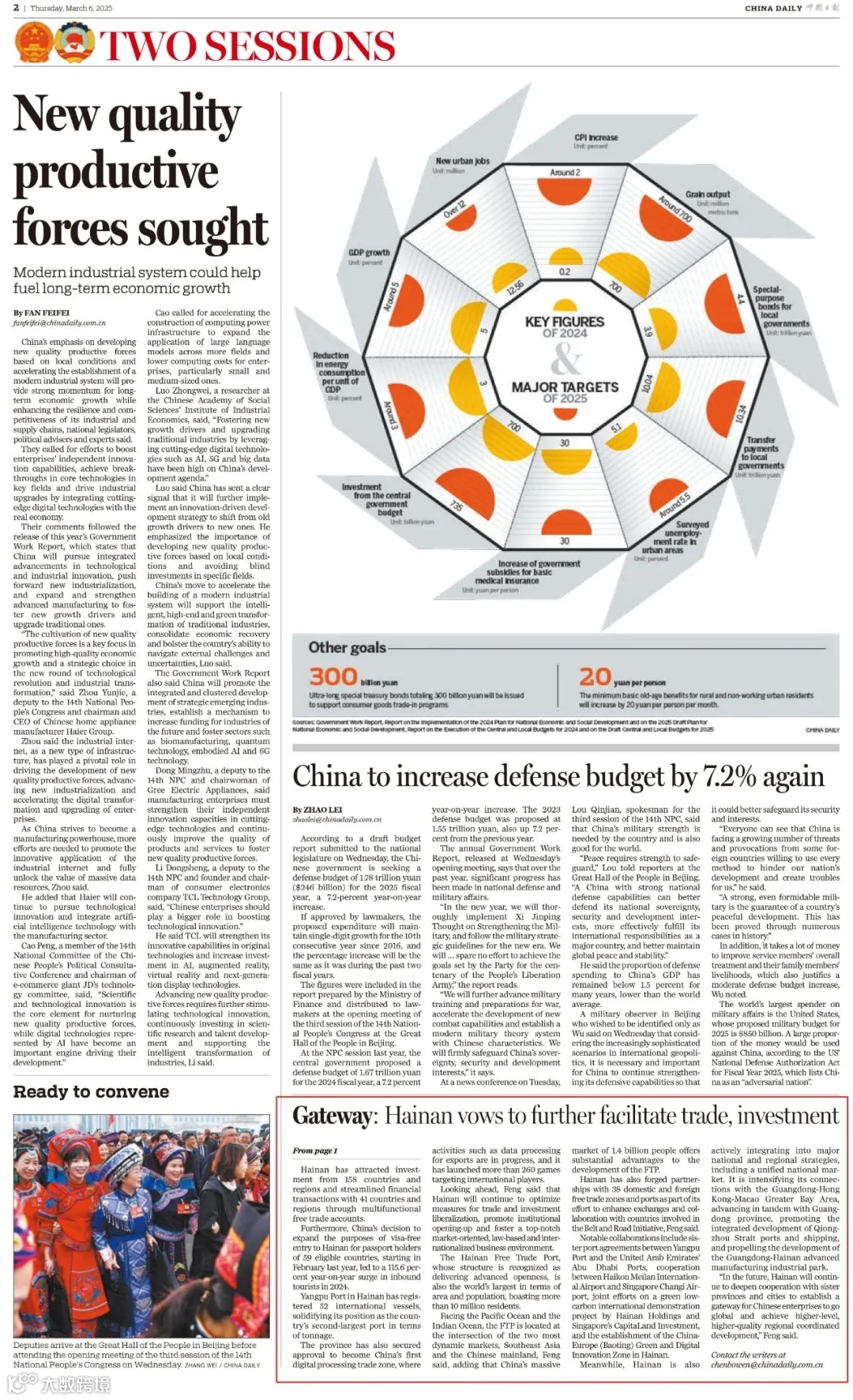 3月6日,《中国日报》头版刊发文章“Hainan makes big strides as key gateway for opening-up”,对海南省委书记冯飞进行了专访。以下是版面图及全文: