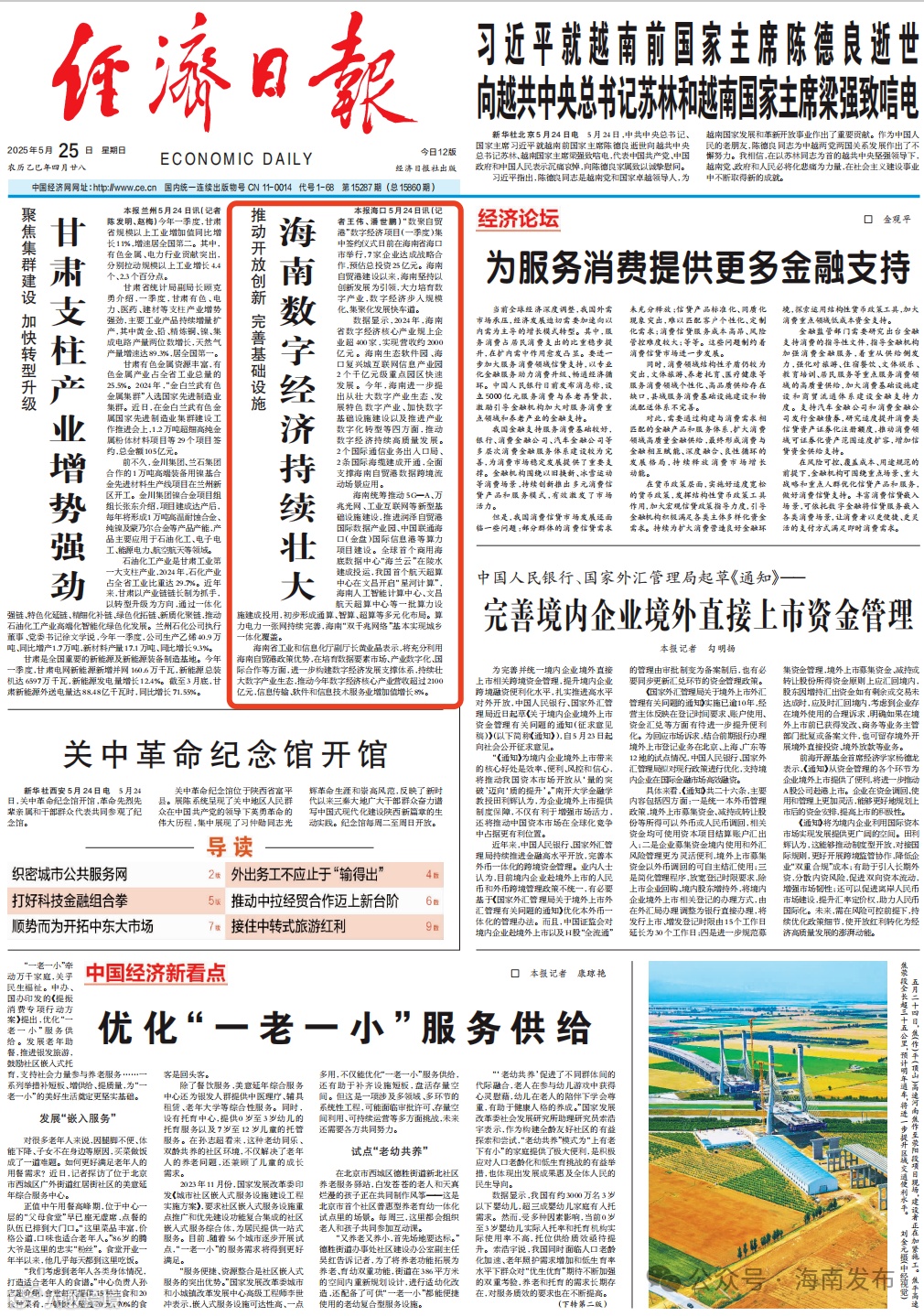 5月25日,《经济日报》头版刊发文章《海南数字经济持续壮大》,版面图及全文如下: