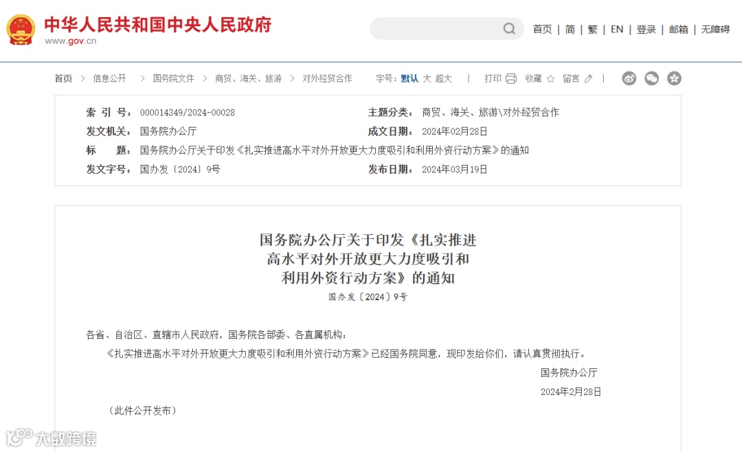 外商投资是参与中国式现代化建设、推动中国经济与世界经济共同繁荣发展的重要力量。扎实推进高水平对外开放、更大力度吸引和利用外资,必须坚持以习近平新时代中国特色社会主义思想为指导,完整、准确、全面贯彻新发展理念,更好统筹国内国际两个大局,营造市场化、法治化、国际化一流营商环境,充分发挥我国超大规模市场优势,巩固外资在华发展信心,提升贸易投资合作质量和水平。为贯彻落实党中央、国务院决策部署,现制定如下行动方案。