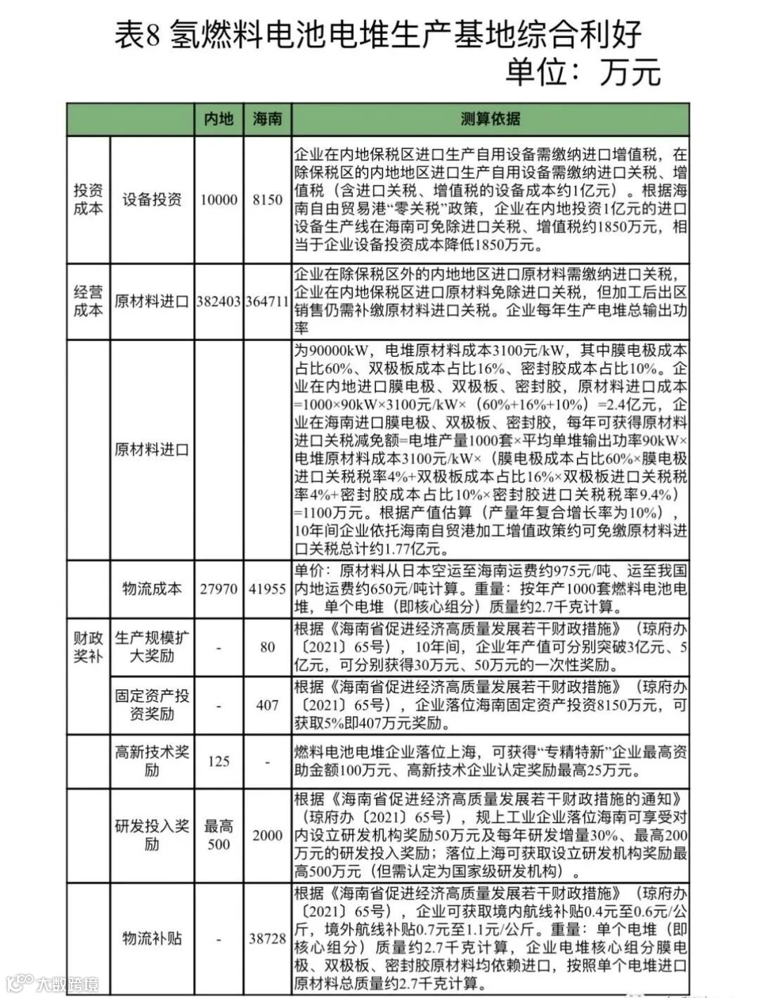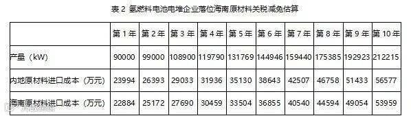 企业年产1000套50-130kW的燃料电池电堆,膜电极、双极板、密封胶等原材料完全依赖进口,进口设备生产线在内地需投资1亿元,将年营收的10%投入研发。海南自由贸易港政策下,与内地相比,1亿元的进口设备生产线投资可节省约2255万元(计入设备固定资产投资奖励);生产制造10年内,若产量年复合增长率10%,原材料进口、物流等经营成本(计入物流补贴)可节省约4亿元,生产经营、研发投入等奖励可多获取1455万元。