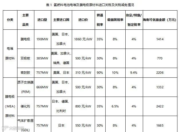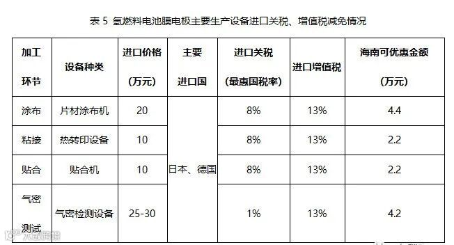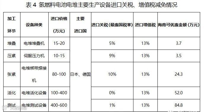氢燃料电池电堆生产制造工艺流程包括堆叠和预装配、压缩、张紧、泄漏测试、定型装配、活化和测试等环节,过程一致性、密封性要求高,特别是电堆活化、测试等设备采取进口较为常见。企业落位海南自由贸易港,选择引进国外电堆生产线,将享受零关税政策下进口关税、增值税减免利好。
