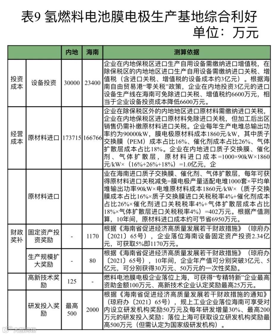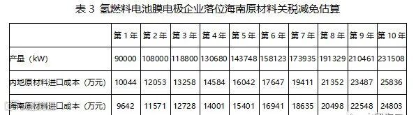企业落位海南自由贸易港,建设年产30-40万片膜电极、适配1000套50-130kW的燃料电池电堆膜电极(一个电堆约需300-400片膜电极)。企业在内地投资进口生产线需3亿元,质子交换膜、催化剂、气体扩散层等原材料完全进口,将年营收的10%投入研发。海南自由贸易港政策下,与内地相比,进口设备生产线投资可节省7770万元(计入设备投资补贴);生产制造10年内,若产量年复合增长率20%,原材料进口可节省约6950万元,生产规模、研发投入奖补可多获取1455万元。随着国内氢燃料电池产能快速增长,企业落位海南的经营成本利好空间将大幅提升。