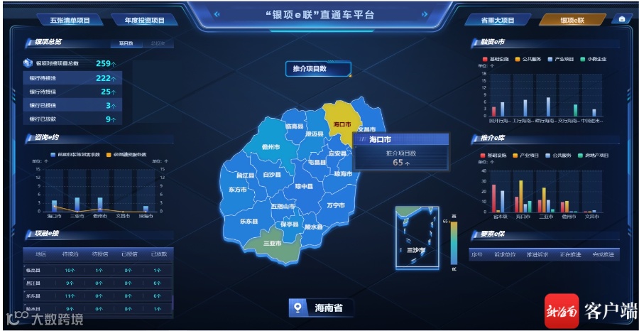 平台上线2个月以来,已推介项目295个,银行对接项目数259个,其中已放款项目9个,实现昌化江雨林生态修复综合治理、三亚低碳智慧能源综合利用、未来社区(金牌文居)等项目贷款签约放款 39.43亿元,有效发挥投贷联动试点合作机制的积极作用,为海南自由贸易港重大项目建设提供强有力的金融支撑。