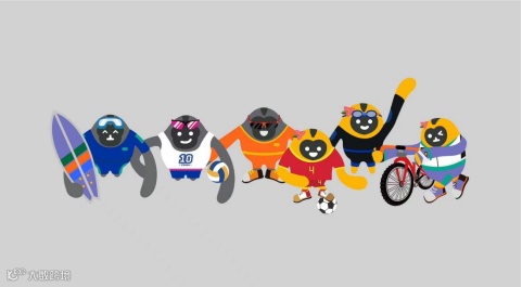 从左到右依次是:冲浪猿、沙滩排球猿、滑翔伞猿、足球猿、帆船猿、自行车猿