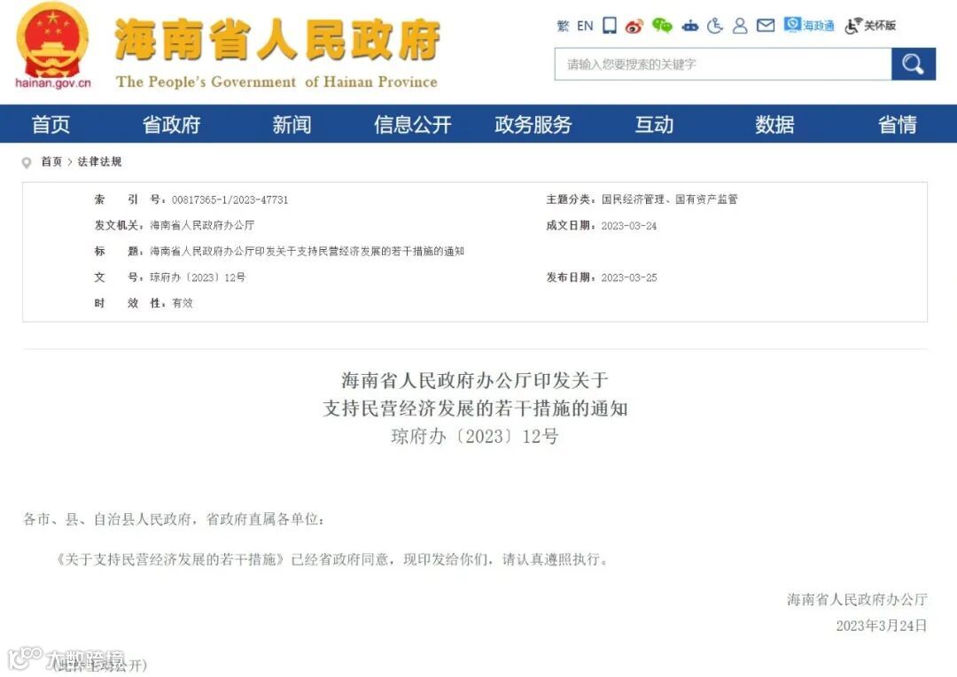 《措施》中还提出,进一步激发民间投资活力和潜力。支持民间投资参与自由贸易港重点项目建设。大力拓宽民间投资领域。积极引导民营企业盘活资产。多源引流提供民营经济融资支持。加大金融服务民营经济力度。充分发挥融资担保公司增信作用。强化金融服务平台作用。多渠道为民营企业提供融资支持。对阶段性困难民营企业予以帮扶。