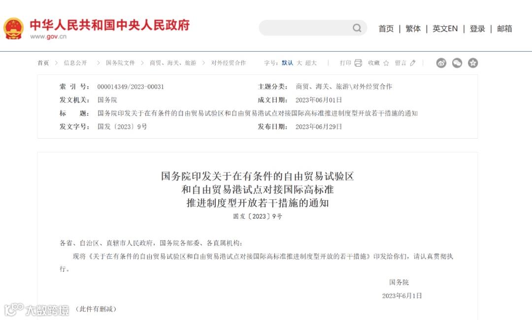 6月29日电 国务院印发《关于在有条件的自由贸易试验区和自由贸易港试点对接国际高标准推进制度型开放的若干措施》(以下简称《若干措施》),率先在上海、广东、天津、福建、北京等具备条件的自由贸易试验区和海南自由贸易港,试点对接相关国际高标准经贸规则,稳步扩大制度型开放。