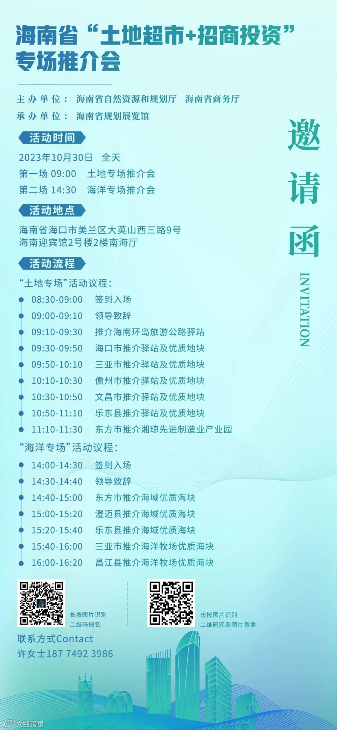 海南省“土地超市+招商投资”专场推介会将于2023年10月30日在海南海口举办,海口、三亚、儋州、文昌、乐东、东方6个市县将组成“土地专场”,推介驿站和优质地块以及产业园;东方、澄迈、乐东、三亚、昌江5个市县将组成“海洋专场”,推介海域和海洋牧场优质海块。